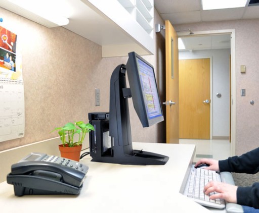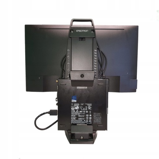 Przykładowe zdjęcia zamontowanych komputerów i monitorów w podstawie Ergotron