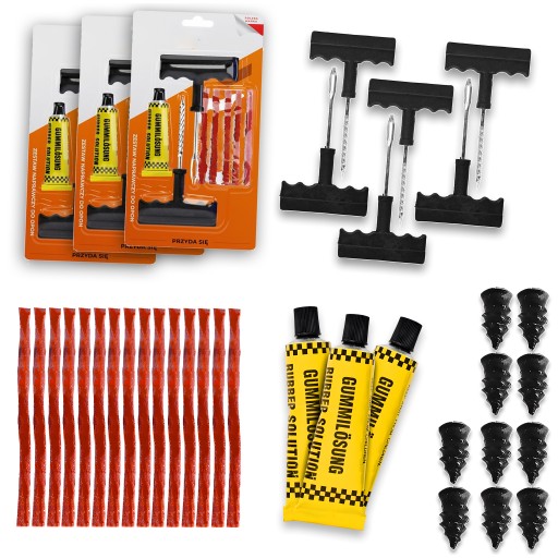 | 3x WIERTŁO | 3x SZYDŁO | 15x SZNURKI WULKANIZACYJNE | 3x KLEJ | 10X WKRĘTY WULKANIZACYJNE |