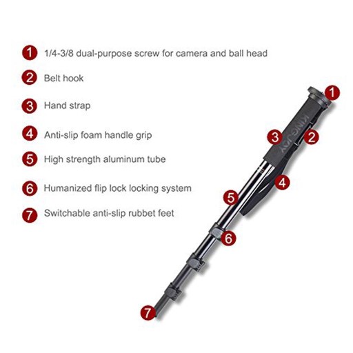 MP208F monopod ze standardową śrubą przepiętą, lekką wagą i elastyczną, zwartą i szybką opcją jest to do najlepszego wyboru dla szybkiego wybierania, przybycie na uzyskanie dostępu, fotografii podróży i sportów ekstremalnych dalej