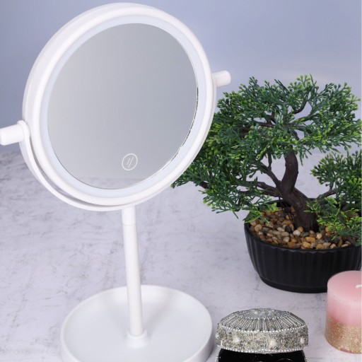 Podstawa i obudowa lusterka wykonane są z wysokiej jakości tworzywa sztucznego, co gwarantuje trwałość oraz nowoczesny wygląd, który doskonale wpasuje się w wystrój każdej toaletki.