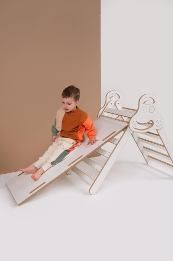 Pikler ze zjeżdżalnią w domu, to plac zabaw IDEALNY! Z jednej strony płyty jest ścianka wspinaczkowa, a z drugiej superśliska zjeżdżalnia. Jeśli masz już bujak, pikler idealnie dopełni cały zestaw - te elementy można połączyć zjeżdżalnią.