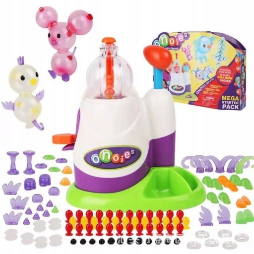 OONIES ZESTAW STARTOWY 19954 baloniki Zestaw zawiera wszystko, co potrzebne, aby zacząć zabawę Oonies. Napompuj baloniki Oonies za pomocą dołączonej pompki. Użyj akcesoriów i łączników, aby zrobić z Oonies różne figurki, dekoracje i niesamowite kompozycje. Balonikami możesz bawić się w różne gry, przyczepiać je na lustrze, oknie lub tworzyć z nich wieżę, a nawet bawić się w wyścigi. Oonies możesz napompować do różnych wielkości, wskazanych na pompce. Zawartość zestawu: 1 Pompka Oonies, 36 Baloników Oonies, 42 akcesoria.