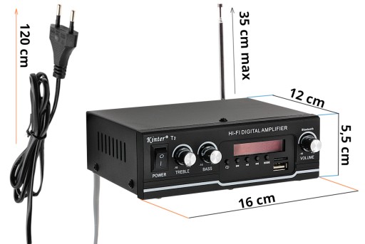 Wielofunkcyjny mini wzmacniacz audio Kinter T2, który doskonale sprawdzi się w różnych systemach audio. Dzięki nowoczesnemu chipowi audio, wzmacniacz zapewnia doskonałą jakość dźwięku Hi-Fi, a wbudowany moduł Bluetooth umożliwia bezprzewodowe odtwarzanie muzyki. Jest to idealne rozwiązanie do użytku w domu, biurze lub w warsztacie.
