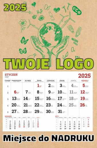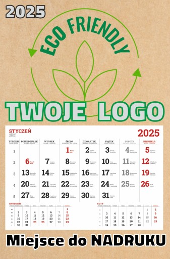 Główka / plecki tego modelu kalendarza drukowane są w pełnym kolorze ale bez użycia koloru białego, co pozwala na dowolne opracowanie graficzne, umieszczenie znaków firmowych, zdjęć, tekstów w dowolnych kolorach. Podłoże użyte do zadruku to papier KRAFTLINER o gramaturze 300g, gwarantujący bardzo dobrą jakość kolorów. Papier ten charakteryzuje się wyjątkową powierzchnią. Jedna strona papieru jest gładka i brązowa, co nadaje elegancji i umożliwia doskonały druk grafiki, podczas gdy druga strona jest szara i chropowata. Te cechy czynią Krafliner 300 g doskonałym wyborem do tworzenia trwałych, stylowych i funkcjonalnych kalendarzy, które wyróżniają się pod względem zarówno wizualnym, jak i praktycznym. W górnej części główki znajduje się otwór umożliwiający zawieszenie kalendarza. Górna krawędź kalendarza dodatkowo jest zaginana i klejona, co wzmacnia jego sztywność. Pośrodku kalendarza, powyżej kalendarium przebiega linia bigowania, dzięki czemu łatwo złożyć go na pół. Główka kalendarza jest jednocześnie jego pleckami - do główki w jej dolnej części przyklejone jest kalendarium.