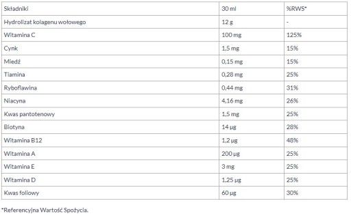 Sok jabłkowy z zagęszczonego soku jabłkowego, hydrolizat kolagenu wołowego, regulator kwasowości: kwas cytrynowy, witamina C (kwas L-askorbinowy), aromat, cynk (glukonian cynku), witamina E (octan DL-alfa-tokoferylu), niacyna (amid kwasu nikotynowego), kwas pantotenowy (D-pantotenian wapnia), miedź (glukonian miedzi (II)), ryboflawina (ryboflawina), tiamina (monoazotan tiaminy), witamina A (octan retinylu), kwas foliowy (kwas pteroilomonoglutaminowy), biotyna (D-biotyna), witamina B12 (cyjanokobalamina), witamina D (cholekalcyferol).