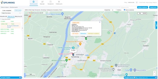 Odtwarzanie historii przebytej trasy wraz z punktami postojów(czas trwania parkingu od/do).