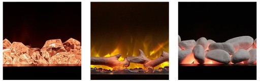 Wymienne materiały dekoracyjne (polana, akrylowe kryształki, białe otoczaki) umożliwiają łatwe wkomponowanie Winslow’a w każdy styl aranżacji wnętrz, a wielobarwne podświetlenie ramy kominka oraz paleniska zapewnia dodatkowe walory estetyczne.