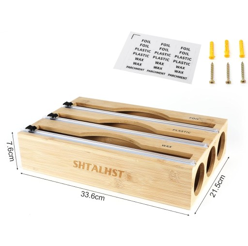 - Krajalnica do folii 3 w 1 może przechowywać 3 różne opakowania jednocześnie, dzięki czemu podobne artykuły można przechowywać w tym samym miejscu i przechowywać je w porządku. Idealnie nadaje się do folii, papieru pergaminowego, papieru woskowanego, folii spożywczej lub nawet torebek strunowych.