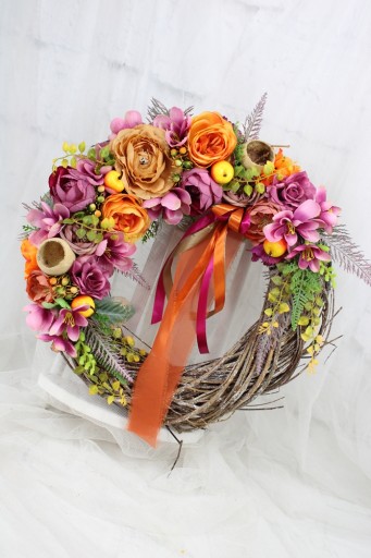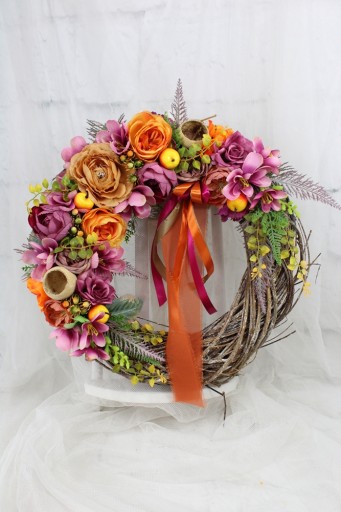 Jesienny oryginalny wianek, wyplatany z winorośli o średnicy 35cm (z dekoracją około 37-38cm) udekorowany kwiatami róż angielskich, pełnika i astrów. W pięknych jesiennych odcieniach.