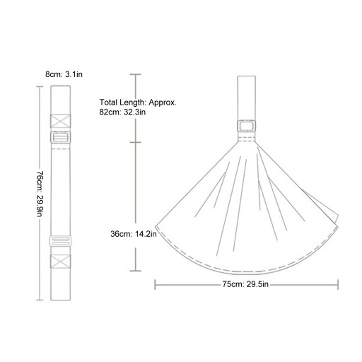 Item Type: Baby Sling Carrier Material: Polyester, Cotton Storage Size: Approx. 8 x 76cm / 3.1 x 29.9in Unfolded Size: Total Length: Approx. 82cm / 32.3in, Width: Approx. 75cm / 29.5in Weight Bearing: Approx. 20kg/44lb Age: 0 to 24 Months Hugging Method: Horizontal Hugging, Vertical Hugging