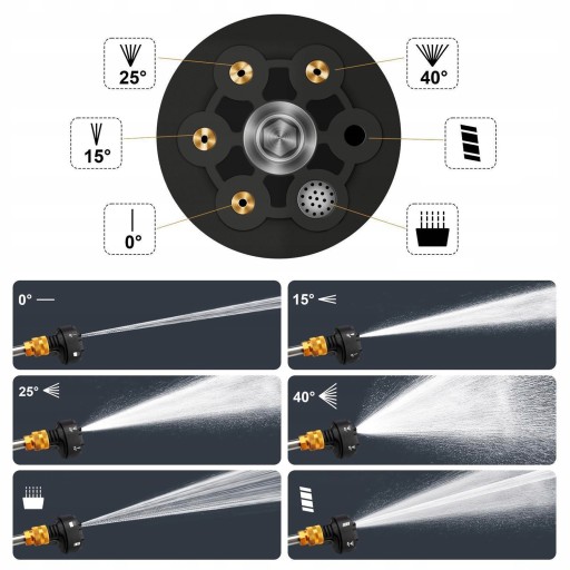 Ręczna myjka ciśnieniowa umożliwia łatwą regulację wzoru natrysku w celu dopasowania go do różnych zadań czyszczenia. Wzory natrysku obejmują „0° High Pressure Jet” do usuwania uporczywych zabrudzeń, „15° Direct Jet” do precyzyjnego mycia, 25° Precision Fan Spray do dokładnego pokrycia, „40° Wide Jet” do większych powierzchni, „Gentle Rinse” do delikatnego czyszczenia i „Foam Spray” do skutecznego czyszczenia pojazdów i przedmiotów.