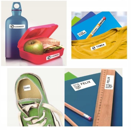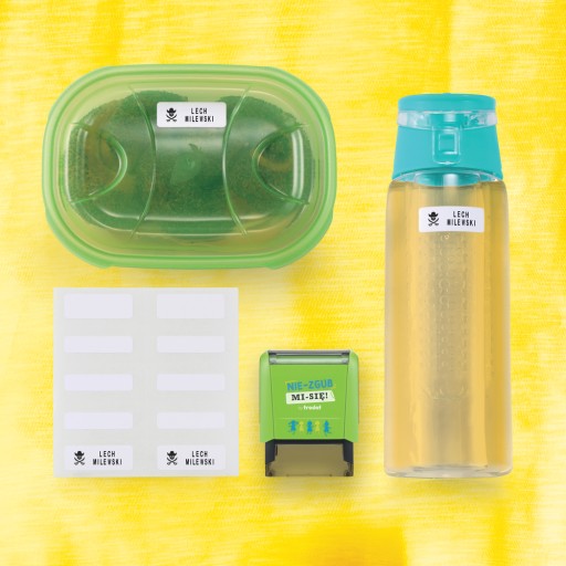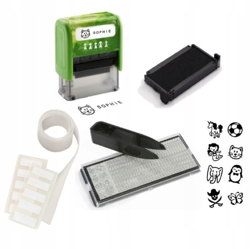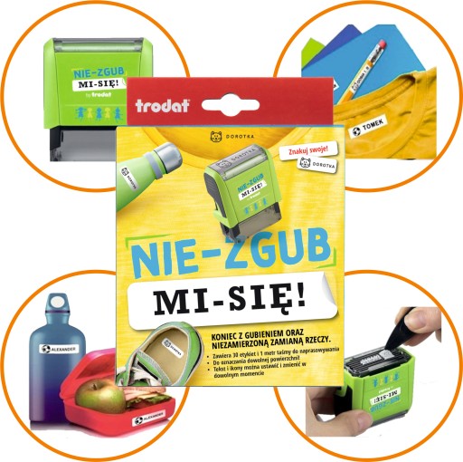 Pieczątki „Nie-zgub Mi-się” umożliwiają błyskawiczne znakowanie wszystkich przedmiotów, chroniąc je tym samym przed zgubieniem lub przypadkową zamianą. Przebadany dermatologicznie, trwały tusz zostawia wyraźne i trwałe odbicia, odporne na pranie i zmywanie w zmywarce, zarówno na tekstyliach, taśmie do naprasowywania i trwałych naklejkach. Zestaw z drukarenką zawiera: pieczątkę, komplet liter, cyfr i ikonek, pozwalających na układanie i zmianę własnego tekstu w każdym momencie, czarną wkładkę tuszującą, a także taśmę do naprasowywania na ciemnych tkaninach oraz etykiety do naklejania na przedmiotach innych niż z tkanin. - 30 etykiet w jednym rozmiarze do naklejania na przedmiotach innych niż z ! Płytka tekstowa, z odbiciem o wielkości 38x14 mm do wykonania odbicia u stemplarza Pieczątka może być wykorzystywana bardzo długo, dzięki zestawowi uzupełniającemu z dodatkowym wkładem tuszującym, taśmą do naprasowywania i etykietami.