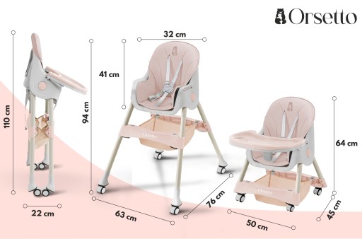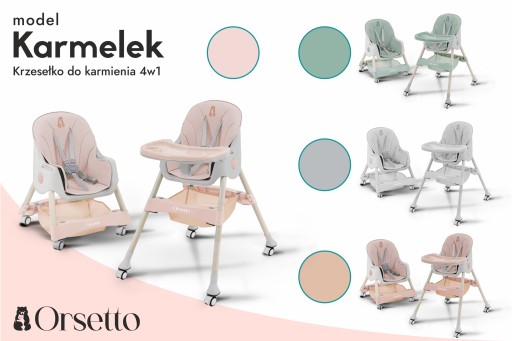Krzesełko do karmienia 4w1 ORSETTO KARMELEK.W codziennym życiu rodzica nie brakuje wyzwań, dlatego z przyjemnością przedstawiamy nasze krzesełko do karmienia ORSETTO KARMELEK. Zostało ono stworzone, aby ułatwić i uprzyjemnić codzienne obowiązki. Poznaj wszechstronne krzesełko 4w1, które dostosowuje się do potrzeb Twojego dziecka w miarę jego wzrostu. Dzięki różnym konfiguracjom - wysokie wolnostojące krzesełko, wysokie krzesełko dosunięte do stołu, niskie wolnostojące krzesełko oraz niskie krzesełko - codzienne zadania staną się prostsze i mniej czasochłonne. ORSETTO KARMELEK to Twój niezastąpiony pomocnik w każdej sytuacji.