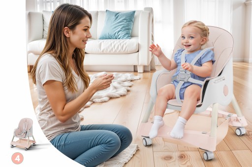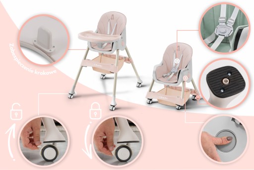 - 4 konfiguracje krzesełka: Wysokie krzesełko z tacką, wysokie krzesełko dosunięte do stołu, niskie krzesełko z tacką, niskie krzesełko.