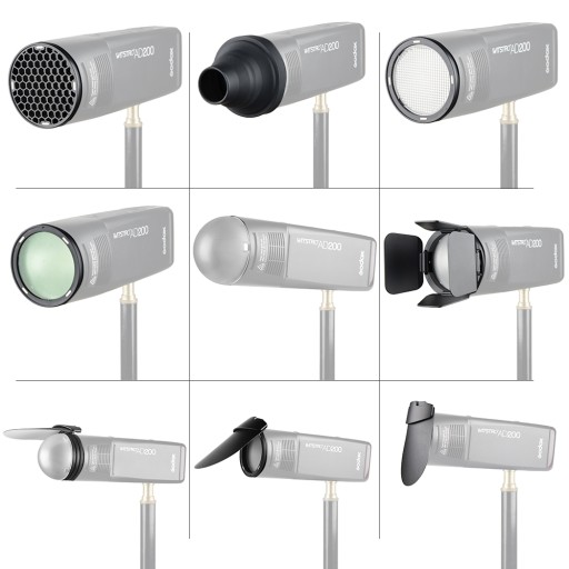 Akcesoria z zestawu pasują do takich lamp jak AD100Pro, głowicy H200R (AD200/200Pro), V1, R1 RGB, a także do lamp reporterskich z prostokątną głowicą po zastosowaniu adaptera S-R1. Dodatkowo pasują do Quadralite Reporter 200, V1.