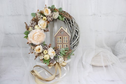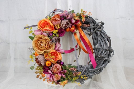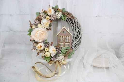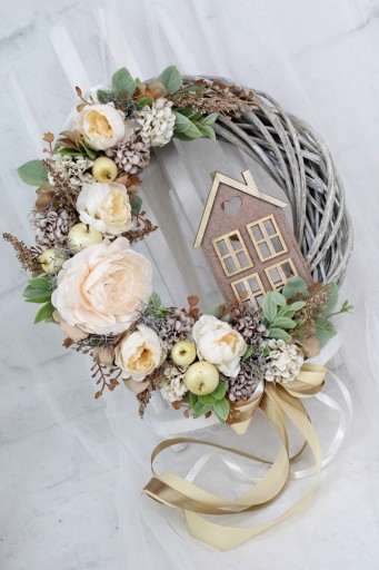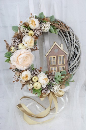 Jesienny, piękny i niepowtarzalny wianek wiklinowy o średnicy 30cm (z dekoracją około 35cm) udekorowany kwiatami kameli, peoni i astrów. W pięknych jesiennych odcieniach kremu i brązu.