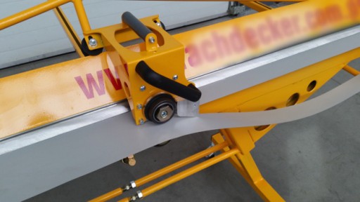 - OPORY PRZEDNIE – pozwalają ustawić szerokość cięcia od przodu zaginarki. Konstrukcja oporów pozwala na obrócenie ich o 180° oraz ich powrót w to samo położenie. Bardzo przydatne do cięcia blach seryjnie. Ograniczniki przednie stosuje się w pracach powtarzalnych. Zachowują one wielokrotnie ten sam wymiar długościowy ciętej blachy. Szybki i dokładny pomiar ciętej blachy można uzyskać poprzez wykorzystanie zainstalowanej miarki.