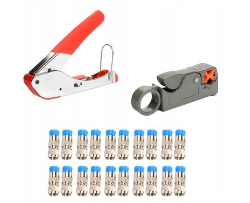 【Opakowanie】 Zestaw naprawczy kabla koncentrycznego zawiera zaciskarkę do kabli koncentrycznych, ściągacz izolacji z kabli koncentrycznych i 20 sztuk złączy kompresyjnych F, ten zestaw narzędzi kompresyjnych jest kompaktowym rozwiązaniem, lekkim i łatwym do przenoszenia!