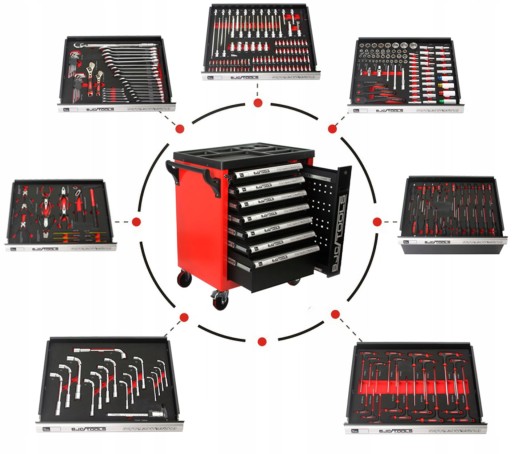 Centralny zamek z dwoma kluczami zamykający wszystkie szuflady oraz podwójne ścianki zabezpieczają narzędzia przed niepożądanym dostępem lub kradzieżą, zapasowy kluczyk w zestawie w przypadku zgubienia jednej sztuki.