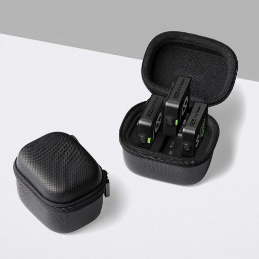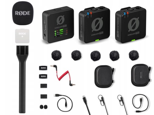 - Kompletny zestaw akcesoriów, w tym inteligentne etui ładujące, dwa mikrofony Lavalier II, kable, magnetyczne klipsy montażowe MagClip GO i etui na akcesoria