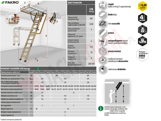 FAKRO LTK Energy to udoskonalona wersja bardzo popularnych schodów na strych FAKRO LTK Thermo. Schody strychowe FAKRO z serii LTK Energy zostały stworzone dla osób które nie lubią półśrodków, a jakość i maksymalne ocieplenie poddasza jest dla nich najważniejsze. Izolacyjność cieplna schodów LTK Energy nie pozostawia sobie równych w tym przedziale cenowym. Schody na strych są bardzo dobrze wykonane i bogato wyposażone: poręcz ułatwiająca wchodzenie oraz biała i bardzo dobrze ocieplona klapa schodów. Wyłaz strychowy FAKRO LTK ENERGY jako bezpośredni następca schodów FAKRO LTK Thermo posiada wszystkie jego najlepsze cechy plus kilka nowości poprawiających izolacyjność schodów i komfort użytkowania. Są to np. nowa konstrukcja klapy schodów, która teraz po otwarciu odchyla się ku tyłowi pozostawiając więcej miejsca na drabince na postawienie stopy podnosząc tym samym komfort oraz bezpieczeństwo użytkowania. Nie sposób także nie wspomnieć o udoskonalonym uszczelnieniu schodów. W tym momencie schody FAKRO LTK Energy posiadają aż dwie uszczelki obwodowe.