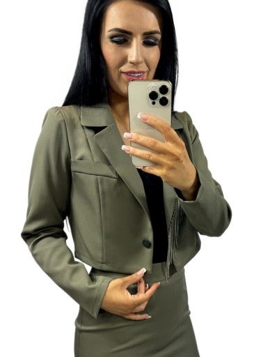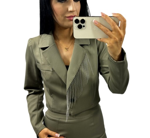 - Marynarka z kołnierzem zdobiona wszytą taśmą z metalowymi frędzlami
