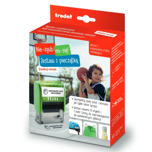 Pieczątki „Nie-zgub Mi-się” umożliwiają błyskawiczne znakowanie wszystkich przedmiotów, chroniąc je tym samym przed zgubieniem lub przypadkową zamianą. Przebadany dermatologicznie, trwały tusz zostawia wyraźne i trwałe odbicia, odporne na pranie i zmywanie w zmywarce, zarówno na tekstyliach, taśmie do naprasowywania i trwałych naklejkach. Zestaw z drukarenką zawiera: pieczątkę, komplet liter, cyfr i ikonek, pozwalających na układanie i zmianę własnego tekstu w każdym momencie, czarną wkładkę tuszującą, a także taśmę do naprasowywania na ciemnych tkaninach oraz etykiety do naklejania na przedmiotach innych niż z tkanin. - 30 etykiet w jednym rozmiarze do naklejania na przedmiotach innych niż z ! Płytka tekstowa, z odbiciem o wielkości 38x14 mm do wykonania odbicia u stemplarza Pieczątka może być wykorzystywana bardzo długo, dzięki zestawowi uzupełniającemu z dodatkowym wkładem tuszującym, taśmą do naprasowywania i etykietami.