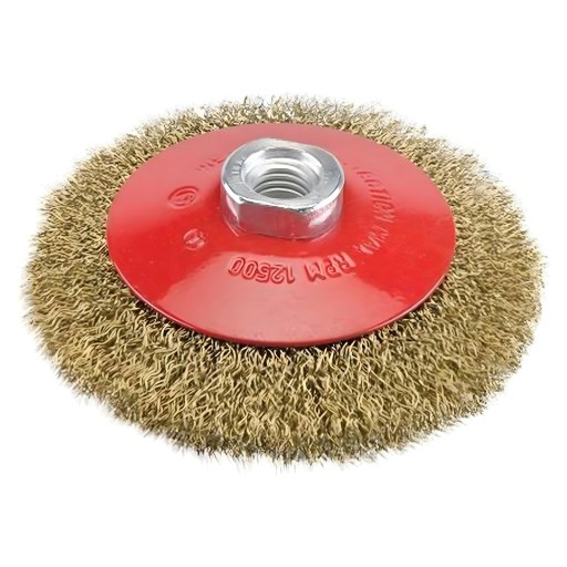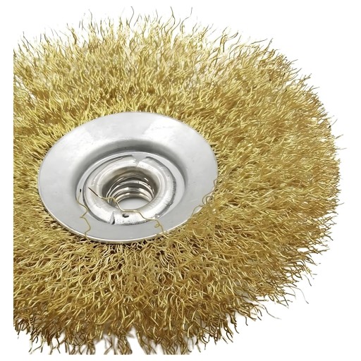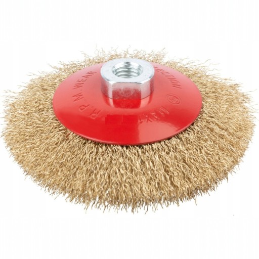 Szczotka druciana na szlifierkę, wykonana z drutu stalowego mosiądzowanego o średnicy 125 mm.