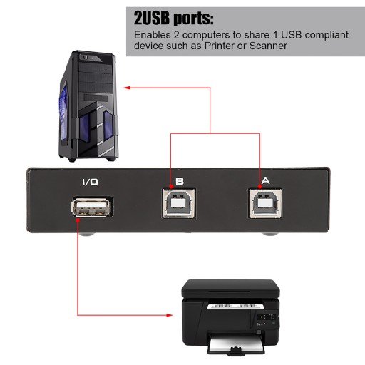 1、With 2/4 USB ports, it enables 2/4 computers to share 1 USB compliant device such as Printer or Scanner 2、It is convenient to switch, just press the relative button. No additional software 3、Standard USB2.0 port, with fast data transfer, and backward compatible with USB1.1 4、The adaptor is no need of external power 5、Compatible with: for Windows 98, Me, 2000, XP, for MAC, MAC 10 systems