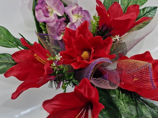 Stroik w komplecie wykonany z kwiatów sztucznych na donicy zalanej betonem.