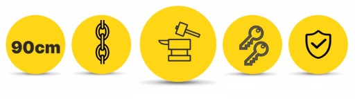 Długość 90 cm, Pasuje do większości hulajnóg, rowerów, Utwardzane ogniwa 6 mm, Odporność na zgniatanie 10KN, Materiał: stal SS400 utwardzana przez kucie, Zabezpieczająca osłona tekstylna, Zatyczka otworu, Waga netto: 0,66 kg, Dwa kluczyki w zestawie