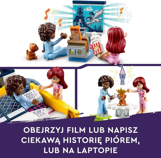 Sześciolatki i starsze dzieci mogą wymyślać własne historie, bawiąc się zestawem LEGO(R) Friends Pokój Aliyi (41740). Zawiera on mnóstwo elementów do odkrycia, gdy Paisley i Aliya piszą historyjki przed pidżama party. Pokój odzwierciedla zainteresowania Aliyi poprzez akcesoria, w tym wypracowania szkolne, fotel biurowy, laptopa, książkę, lampę i puchar. Dzieci docenią też ukryte detale, na przykład złą ocenę na sprawdzianie, którą Aliya schowała pod stosem piątkowych wypracowań! Może Paisley pomoże jej zrozumieć, że nie powinna być wobec siebie taka wymagająca. Gdy przyjdzie czas na relaks, przyjaciółki mogą obejrzeć film na dużym ekranie lub pobawić się zabawkami ze szczeniaczkiem.