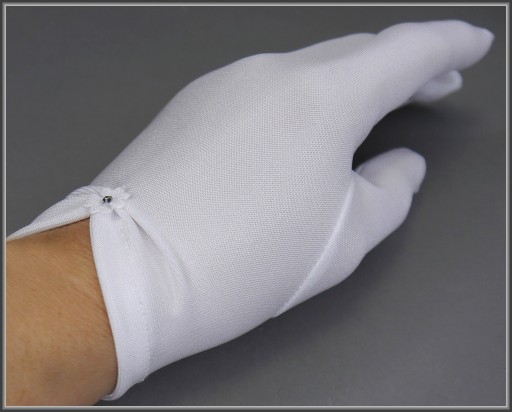 Komplet komunijny w składzie: Torebka z satyny atłasowej odszyta na matową stronę, rękawiczki pięciopalczaste oraz okapnik na świecę. Wszystkie elementy zestawu ozdobione zostały koronkową aplikacją z odrobiną srebrnej nitki. Na życzenie możemy przygotować rękawiczki zakładane na jeden paluszek.