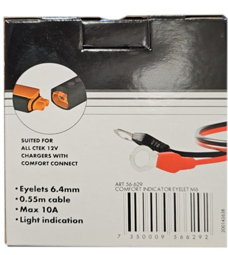 CTEK COMFORT INDICATOR EYELET M6 - Końcówka diodowa naładowania akumulatora, wraz ze specjalną szybko złączką ułatwiającą podłączenie do ładowania. Długość kabla 0,55m, max. prąd ładowania 10A, zakończony oczkiem M8, wskaźnik diodowy.