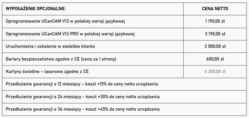 - Oprogramowanie: UCanCAM V12 w polskiej wersji językowej (opcjonalnie)