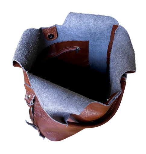 - Od wewnątrz torba wykończona na surowo naturalną gładką skórą zamszową.