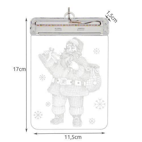 - SPECYFIKACJA - barwa światła: biała ciepła; wzór na witrażu: Mikołaj; ilość lampek w taśmie LED: 6; zasilanie baterie: 3 x AAA (brak w zestawie) wymiary: 17 x 11,5 x 1,5 cm; długość kabla: 19 cm; wymiary opakowania: 18 x 12,5 x 4,5 cm; waga: 108 g; waga w opakowaniu: 121 g.