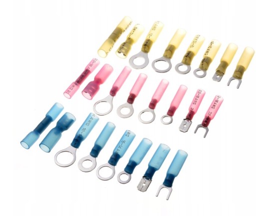 Zestaw miedzianych końcówek i konektorów kablowych -240 sztuk. Końcówki kablowe służą do łączenia kabli z urządzeniami elektrycznymi, innymi kablami, powierzchniami, itp.