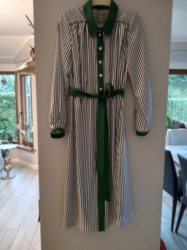 Polecam kupioną we Włoszech elegancką sukienkę w rozm. 40.Kolor: biało-granatowe paski z zielonym wykończeniem.Złote guziczki.