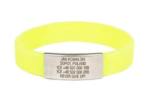 Na opasce ICEstripe Slim masz do dyspozycji 5 linijek tekstu (jeżeli potrzebujesz więcej miejsca sugerujemy wybór opaski ICEstripe Elite), w których możesz zamieścić najważniejsze informacje o swojej osobie. Dane zostaną wygrawerowane laserowo na identyfikatorze ze stali nierdzewnej.