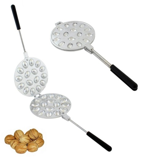 Metalowa forma do pieczenia ciastek w niecodziennym kształcie orzechów włoskich! Zastosowanie specjalnego stopu umożliwia szybkie nagrzewanie się formy oraz długo utrzymuje ciepło. Posiada dwie solidne rączki które chronią dłonie przed poparzeniem i ułatwiają obsługę. Forma umożliwia jednorazowe upieczenie 16 połówek orzeszków. Przeznaczona do kuchenek gazowych!