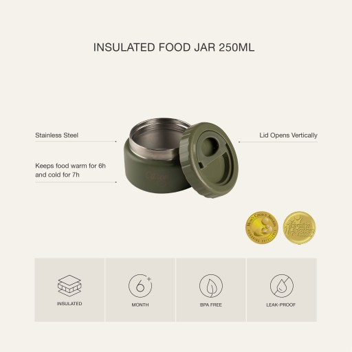 Ten kompaktowy termos na posiłki o pojemności 250ml, to idealne rozwiązanie do przechowywania przekąsek, lub małych posiłków zarówno w niskich, jak i wysokich temperaturach. Wykonany ze stali nierdzewnej i materiałów niezawierających bisfenolu A, termos utrzyma ciepło potraw przez 6 godzin i zimno przez 7 godzin.