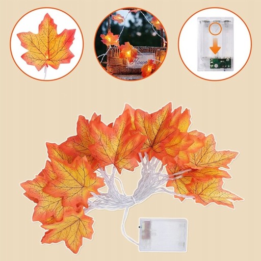 GIRLANDA ŚWIETLNA LAMPKI LED Z LIŚĆMI KLONU 3M 20LED DO DOMU DEKORACAJA JESIEŃ HALLOWEEN