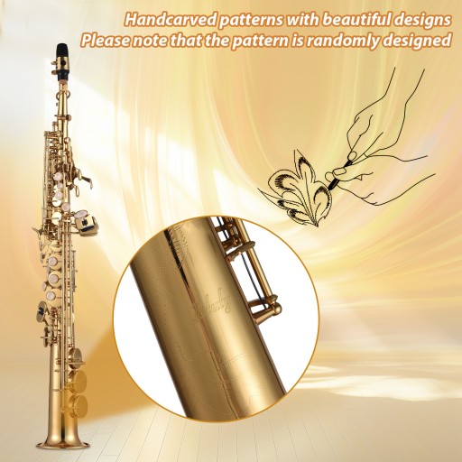 【Wysokiej jakości mosiężna konstrukcja】: Ten prosty saksofon sopranowy B-flat jest wykonany z wysokiej jakości surowca, co zapewnia jego trwałość i długowieczność. Jego wysoka jakość konstrukcji pozwala na późniejsze zastosowanie, dzięki czemu jest dostępny instrumentem dla różnych, jak i wyposażonych w gry.