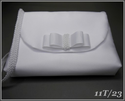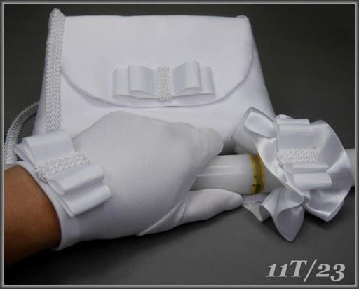 Komplet komunijny; torebka komunijna z satyny ślubnej pierwszego gatunku w kształcie woreczka z usztywniająca wkładką pomagającą w zachowaniu kształtu nawet po obciążeniu i rękawiczki komunijne ozdobione rypsową kokardką z jedwabnym plecionym sznurkiem. Do kompletu przygotowaliśmy również okapnik na świecę komunijną oraz opaskę dostępną na naszych pozostałych aukcjach.