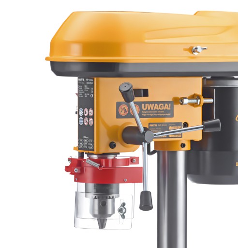 Wiertarka wyposażona w dodatkowe zabezpieczenie przed otwarciem osłony w czasie pracy.