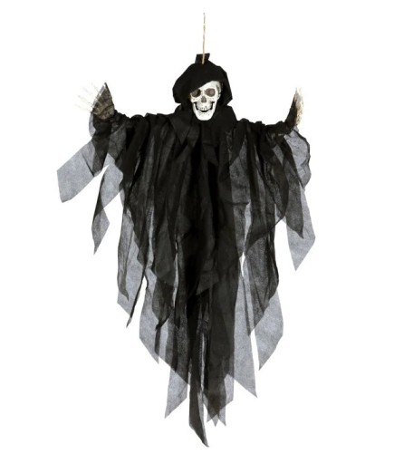 Wisząca dekoracja szkielet w czarny szacie. Długość 75 cm.