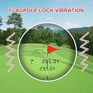 [Slope On & Pin Lock Vibration] — gdy pin nachodzi na tło, naciśnij i przytrzymaj przycisk pomiaru, aby rozpocząć skanowanie. Po rozpoznaniu flagi zablokuje dane pomiarowe i uruchomi wibrację, aby o tym przypomnieć. W trybie slope-on wyświetlane są kąt, odległość linii wzroku i odległość kompensacji pola golfowego