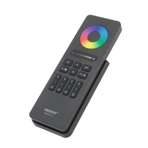 Pilot do sterowania oświetleniem LED RGB+W, RGB CCT. Obsługuje kontrolowanie koloru, temperatury barwowej, stopnia jasności oraz regulację trybu oświetlenia.