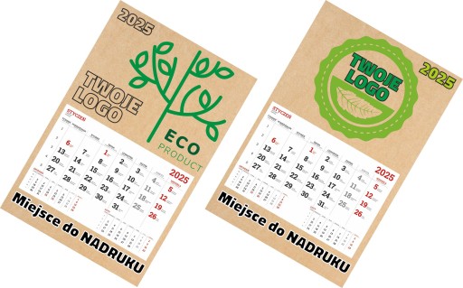 Główka / plecki tego modelu kalendarza drukowane są w pełnym kolorze ale bez użycia koloru białego, co pozwala na dowolne opracowanie graficzne, umieszczenie znaków firmowych, zdjęć, tekstów w dowolnych kolorach. Podłoże użyte do zadruku to papier KRAFTLINER o gramaturze 300g, gwarantujący bardzo dobrą jakość kolorów. Papier ten charakteryzuje się wyjątkową powierzchnią. Jedna strona papieru jest gładka i brązowa, co nadaje elegancji i umożliwia doskonały druk grafiki, podczas gdy druga strona jest szara i chropowata. Te cechy czynią Krafliner 300 g doskonałym wyborem do tworzenia trwałych, stylowych i funkcjonalnych kalendarzy, które wyróżniają się pod względem zarówno wizualnym, jak i praktycznym. W górnej części główki znajduje się otwór umożliwiający zawieszenie kalendarza. Górna krawędź kalendarza dodatkowo jest zaginana i klejona, co wzmacnia jego sztywność. Pośrodku kalendarza, powyżej kalendarium przebiega linia bigowania, dzięki czemu łatwo złożyć go na pół. Główka kalendarza jest jednocześnie jego pleckami - do główki w jej dolnej części przyklejone jest kalendarium.